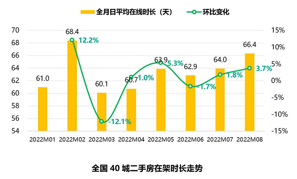 2022年8月,全国40城二手房在架时长为66.4天,相比7月增加了3.7%。8月二手房在架时长整体呈现出增长的趋势,尤其是在节后出现回落之后,持续出现上涨,8月二手房在架时长已接近2月的水平。从分城市来看,四个一线城市的在架时长都出现上涨,其中深圳的二手房在架时长涨幅最大,达到11.3%。